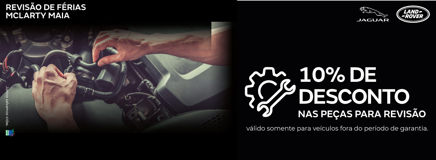 O desconto de 10% no valor de peças para a revisão é válido somente para veículos fora do período de garantia e para as peças e serviços que fazem parte do plano de Revisão Periódica, conforme Manual do Proprietário, caso seja necessária a troca de alguma peça, o valor deverá ser pago pelo cliente. Os descontos não podem ser revertidos em dinheiro em espécie ou outros serviços. As promoções mencionadas neste anúncio não são cumulativas com outras promoções vigentes e são válidas até 31/07/2022. Para a execução de serviços e descontos, é necessário agendamento prévio. Sujeito a disponibilidade de vagas. Para mais informações consulte a McLarty Maia Jaguar Land Rover Brasília.